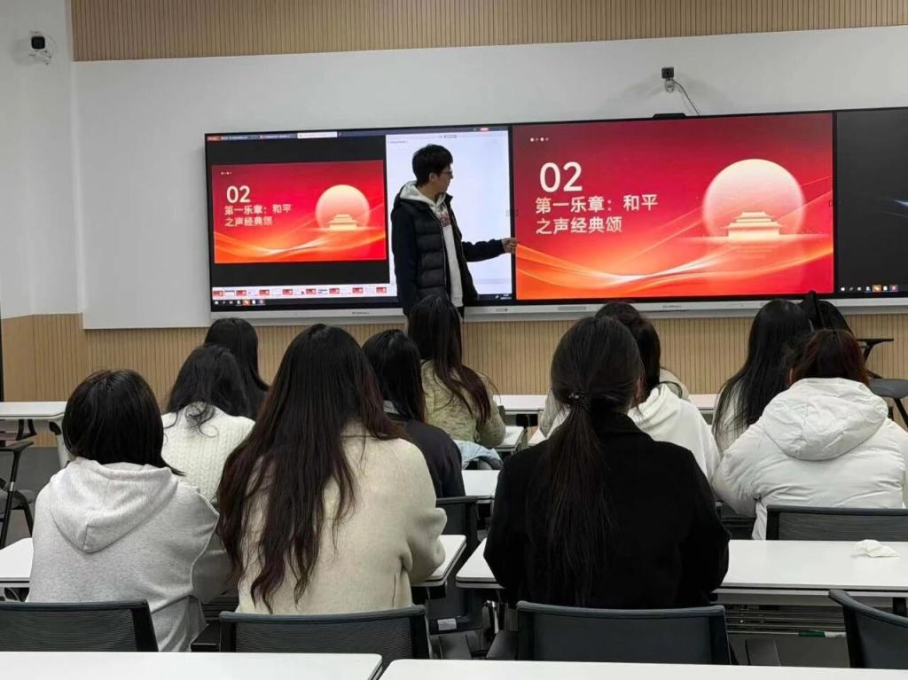 活动中各班团支部积极响应、创新形式,将理论学习与专业特色深度融合。各班支部召开主题班会,通过“和平之声”经典诵读会,组织团员和青年搜集、诵读与和平相关的经典文学作品等,在诵读中感悟和平的崇高与不易;“我身边的和平故事”分享会,鼓励团员和青年分享与参与,从微观视角理解维护和平的具体行动;“和平愿景”创意表达活动,以多种创新形式描绘人类命运共同体美好蓝图的作品。同学们纷纷发言,畅谈以音乐与舞蹈为载体传播和平之声、华夏之姿的青春理想。