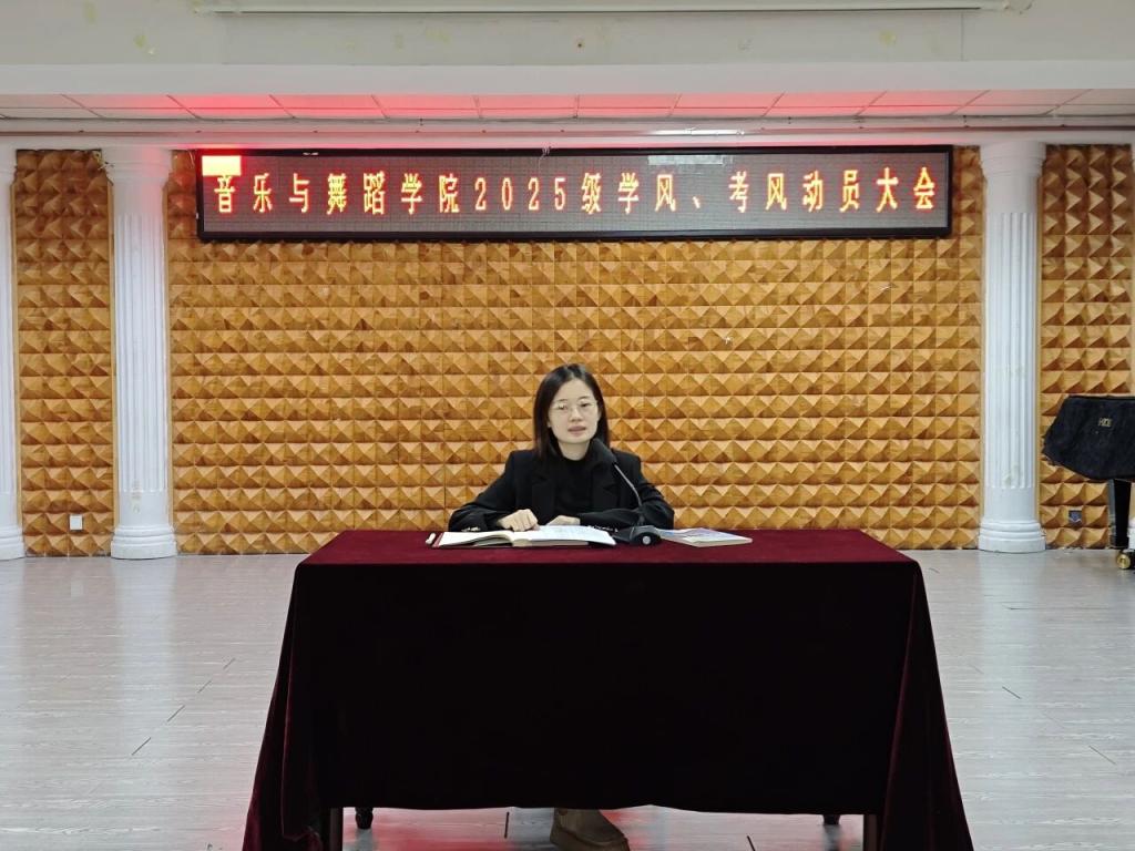为进一步加强学院学风建设,严肃考风考纪,营造积极向上、求真力行的学习氛围,11月26日,音乐与舞蹈学院在艺体楼203召开了2025级学风、考风动员大会。本次动员大会由2025级辅导员孙云玥老师主持,2025级全体学生参加。